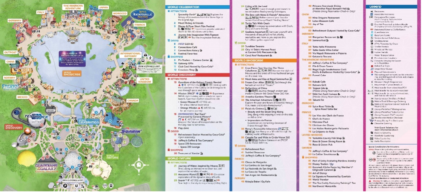 On y retrouve des attractions comme Guardians of the Galaxy, Test Track, Frozen, un aquarium (dont une partie sert à la réhabilitation des lamantins), et tout autour du lac, des pavillons représentant 11 pays.